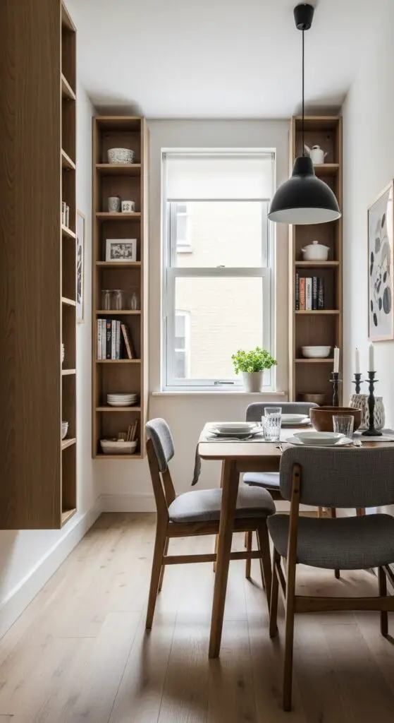 Choose vertical designs that draw the eye upward, creating an illusion of height and spaciousness. Wall-mounted space saving shelving units work exceptionally well, keeping floor space clear for easy movement around your dining table.