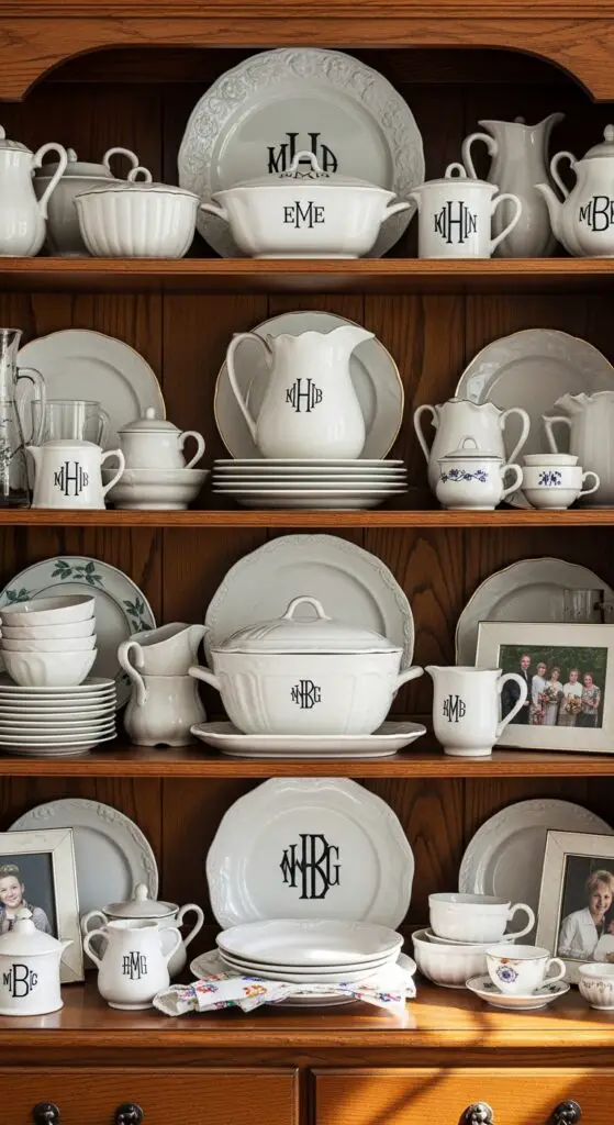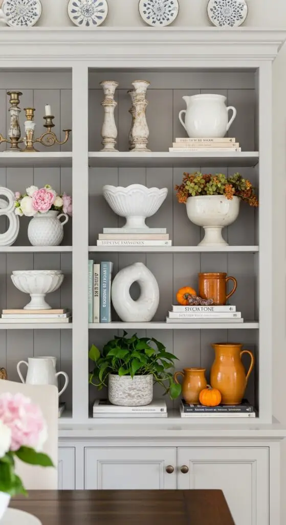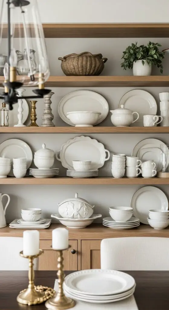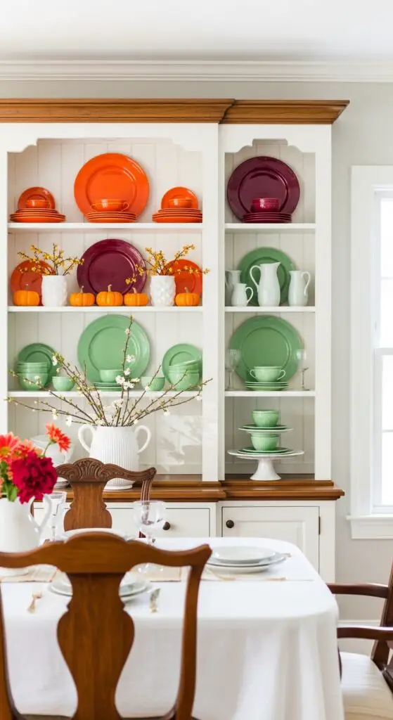Store off-season pieces safely while showcasing current selections on prominent shelves. Create themed tablescapes by pairing coordinated dishes with seasonal accessories like small pumpkins or flowering branches. A bright white backdrop enhances the visual impact of your seasonal displays while maintaining that clean, airy aesthetic. This approach keeps your hutch display fresh and engaging, allowing you to express creativity while maintaining an organized, purposeful arrangement that celebrates each season’s unique character.