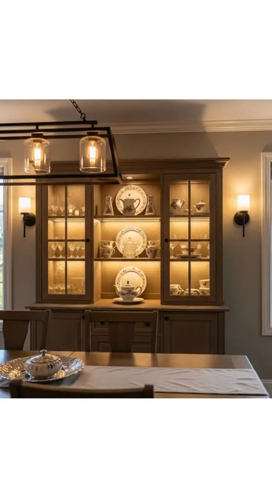 Proper lighting metamorphoses your dining room hutch from a simple storage piece into a stunning focal point that showcases your most cherished collections. You’ll want to create depth by combining three lighting layers.