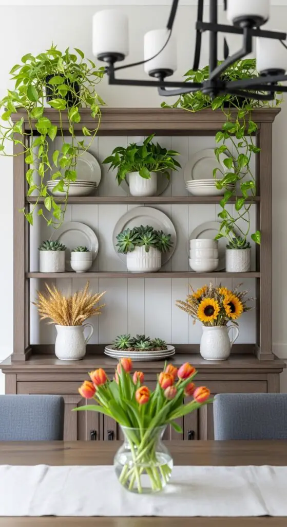 Adding plants and greenery to your hutch display breathes life into your dining room while creating a revitalizing focal point that complements your dishware collection. Natural plant displays work beautifully on shelves, with trailing pothos cascading from upper levels or compact succulents nestled between serving pieces.