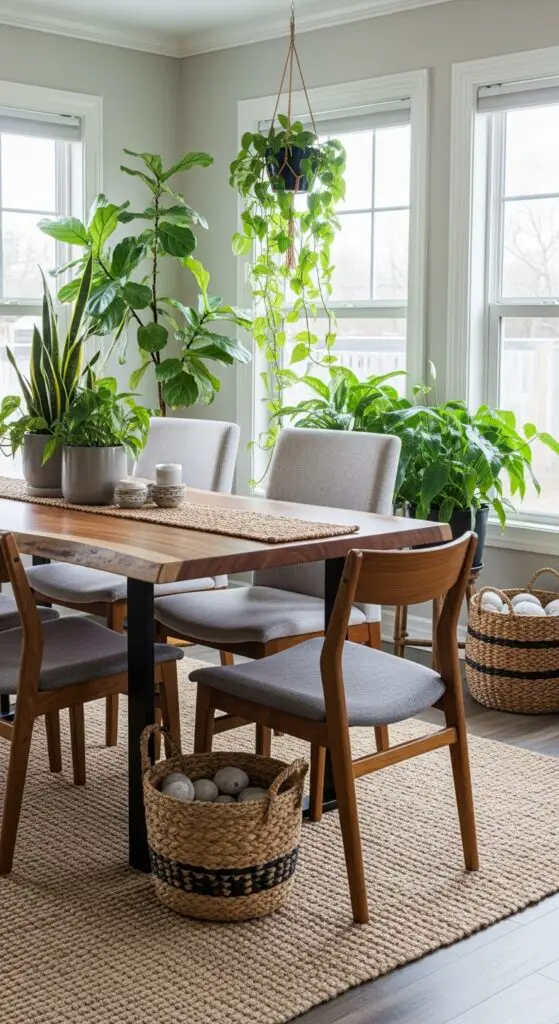 Although artificial lighting and artwork create visual appeal, natural elements breathe life into your dining room in ways that manufactured décor simply can’t match. Bring in natural wood through live-edge dining tables, reclaimed shelving, or rustic serving pieces that add authentic texture and warmth.