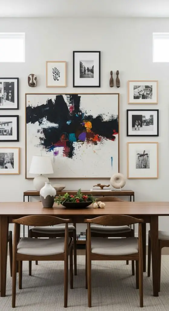 How can one blank wall above your dining table become the room’s most enchanting focal point? Metamorphose it into a mesmerizing gallery wall that’ll ignite dinner discussions for years.