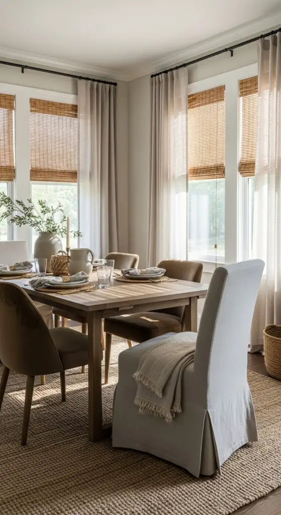 For windows, integrate natural fibers through bamboo blinds paired with flowing linen curtains, or combine wooden shutters with soft fabric panels. Mix smooth and rough textures deliberately—velvet drapes against rattan shades create variable contrast that changes ordinary meals into enhanced dining experiences. The right rug will anchor your furniture while providing the comfort and warmth needed to create an elevated dining atmosphere.