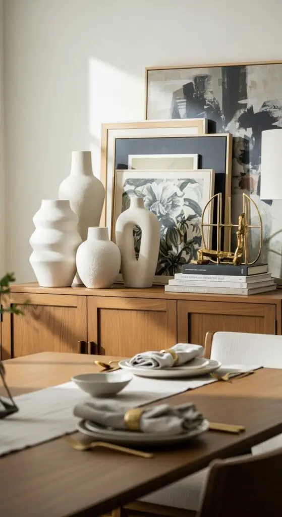 Your sideboard or console serves as both functional storage and a prime opportunity to showcase your personal style through carefully curated displays. Create fluid arrangements by grouping items in odd numbers and varying heights to curate visual balance naturally.