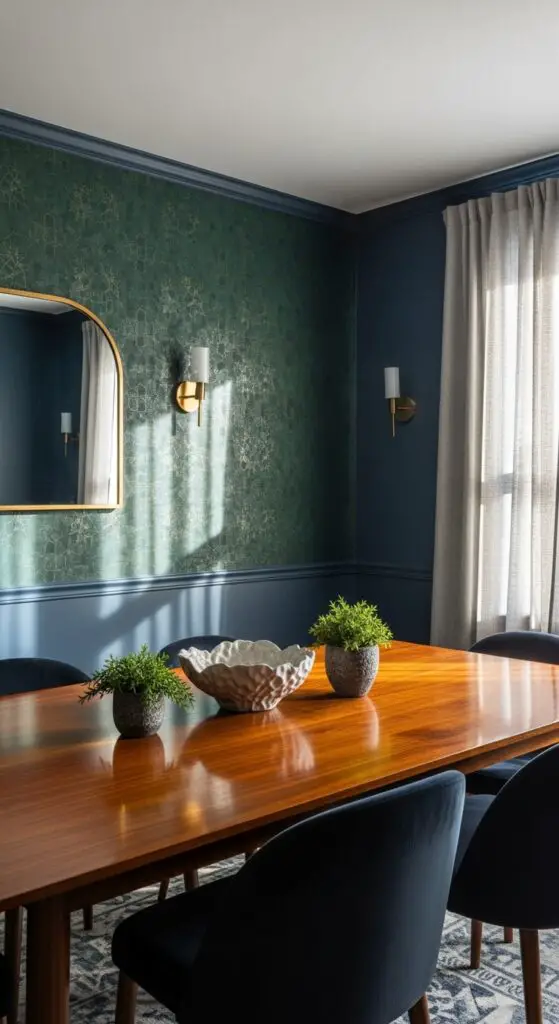 Don’t hesitate to mix painted walls with patterned wallpaper sections. This approach adds depth while maintaining visual balance throughout your space.