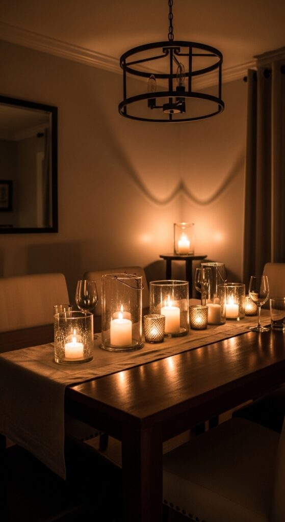 Position lanterns at varying heights to add dimensional warmth throughout your space. For romantic centerpieces, cluster mercury glass votives with fresh flowers or greenery. Hurricane lamps protect flames from drafts while casting beautiful shadows on walls.