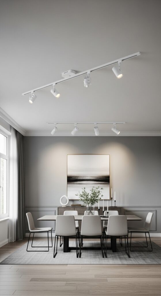 Modern track lighting systems offer unparalleled versatility when you need adjustable illumination that adapts to your dining room’s changing needs. You’ll enjoy complete control over light direction and intensity with individual adjustable fixtures mounted on ceiling tracks.