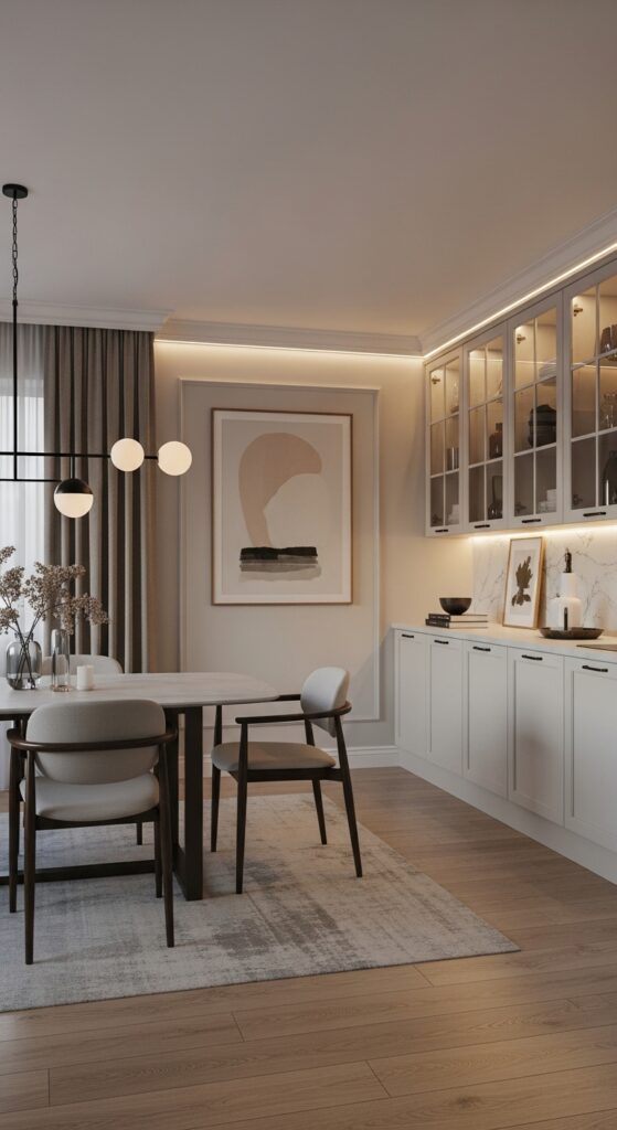 The most successful dining room lighting designs layer three distinct levels of illumination to create depth, functionality, and visual interest throughout your space. You’ll want ambient lighting as your foundation, using recessed cove lighting to provide gentle, overall illumination that eliminates harsh shadows.