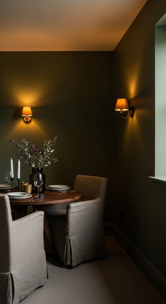 For small dining rooms, sconces paired with deep colors on the walls create a moody atmosphere that enhances the dramatic intimacy of your space.