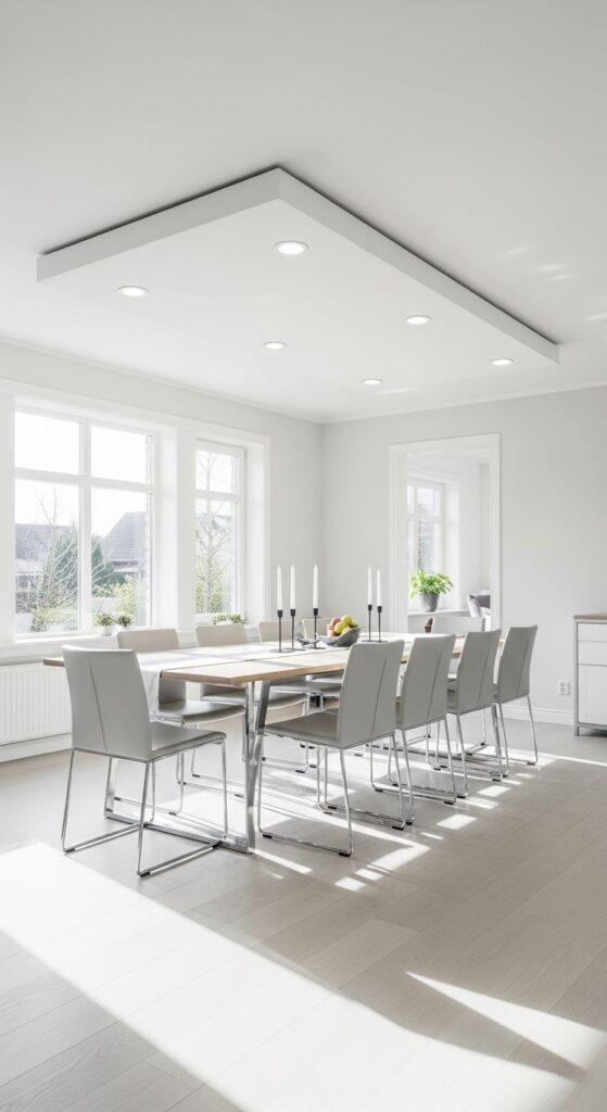 Recessed ceiling lights offer a streamlined alternative to wall-mounted fixtures, providing powerful general lighting through sleek fixtures that virtually disappear into your ceiling. You’ll appreciate how recessed downlights create an uncluttered aesthetic that won’t compete with your dining room’s décor or architectural attributes.