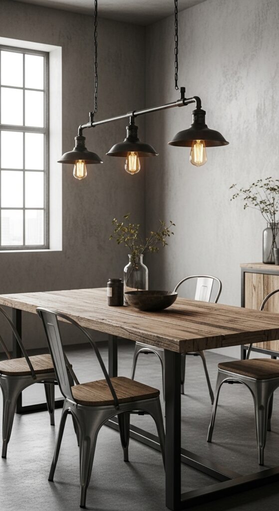 Industrial-style lighting brings raw, edgy sophistication to your dining room through exposed bulbs, metal fixtures, and weathered finishes that celebrate utilitarian design. You’ll create an authentic contemporary atmosphere by choosing fixtures with blackened steel, aged brass, or distressed iron materials.