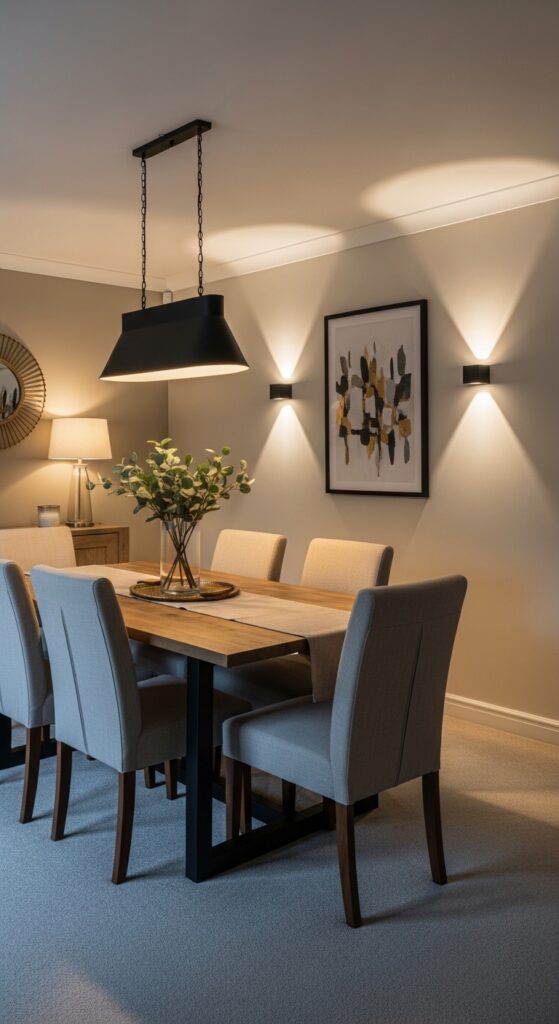 While overhead lighting handles the main illumination, warm wall sconces add the perfect layer of intimate ambiance that alters your dining room into a cozy retreat. You’ll create depth and visual interest by positioning sconces at eye level along your walls.