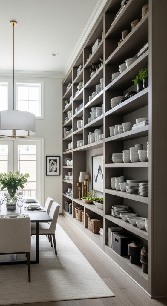 Dramatic floor-to-ceiling shelving alters your dining room into a stunning focal point that commands attention while maximizing every inch of vertical storage space. You’ll create visual drama that draws eyes upward, making your room feel larger and more sophisticated than traditional furniture arrangements.