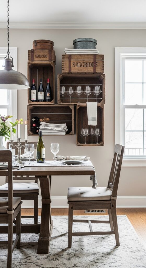 Stack apple crates horizontally for wine bottle storage, or mount old soda boxes as floating shelves for glassware display.