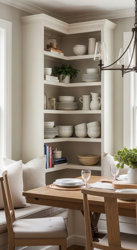 Custom built in shelves work perfectly in corner nook storage situations, fitting seamlessly into odd dimensions that standard furniture can’t accommodate. You can design multiple tiers for different items or incorporate wine storage underneath display shelves. This solution maximizes vertical space while creating visual interest that draws the eye upward, making your dining room feel larger and more organized. Unlike traditional furniture that takes up valuable floor space, wall-mounted shelves keep your dining area open and spacious while providing essential storage.
