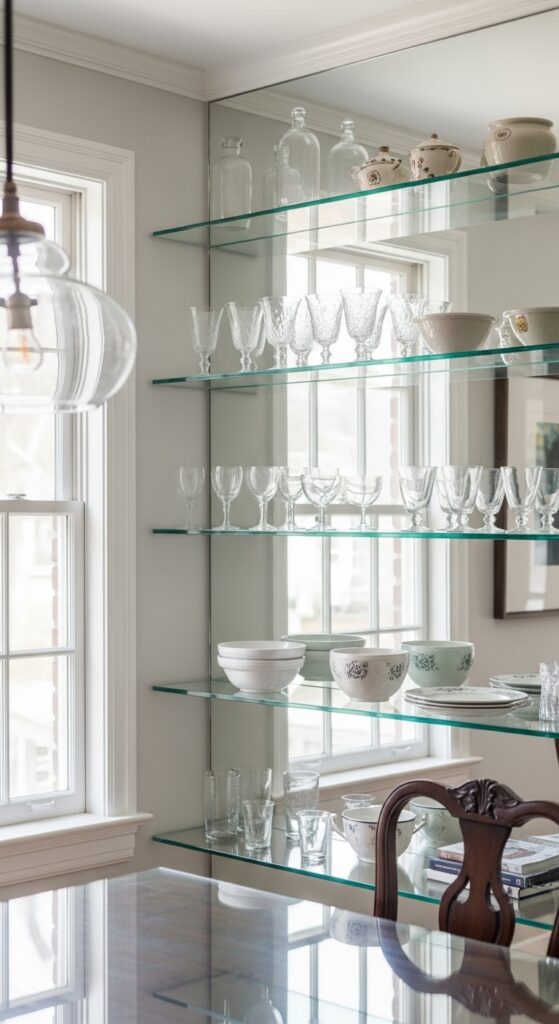 Use glass shelves to showcase collection pieces like vintage glassware, ceramic bowls, or family heirlooms. The clear material disappears visually, making your displayed items the true stars of your dining room design.