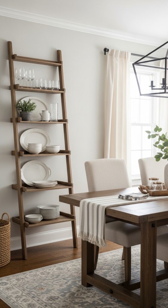 Ladder shelves bring rustic charm and adaptable storage solutions to dining rooms where rigid built-ins won’t work. You’ll appreciate how leaning ladder shelves require no installation while maximizing vertical wall space effectively.