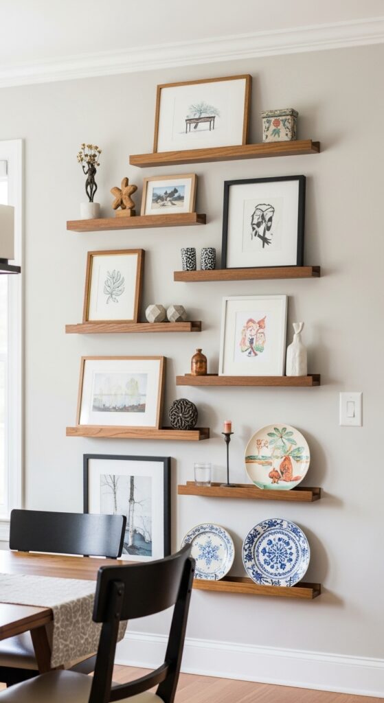 Install multiple ledges at varying heights to create visual interest and accommodate different frame sizes. The front lip prevents items from sliding off while allowing easy rearrangement. Use them for personalized collectible displays like vintage plates, small sculptures, or family heirlooms. You can effortlessly shift from holiday themes to birthday celebrations, keeping your dining space fresh and personally meaningful.