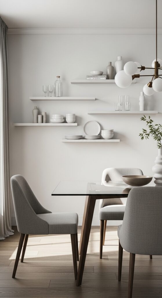 Glass shelves as minimalist centerpieces work beautifully in contemporary and traditional spaces alike. Mount them between windows or along accent walls to maximize natural light reflection. You’ll maintain your room’s open feeling while gaining functional storage. Like reflective mirrors, glass shelves help create the illusion of expanded space while bouncing light throughout your dining area.