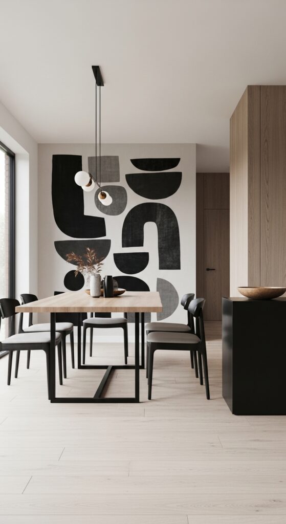 Consider pairing abstract wallpapers with textural wood grain accents on adjacent walls for balanced contrast. You’re creating a dining environment that sparks conversation while maintaining the sleek sophistication that defines contemporary interior design.
