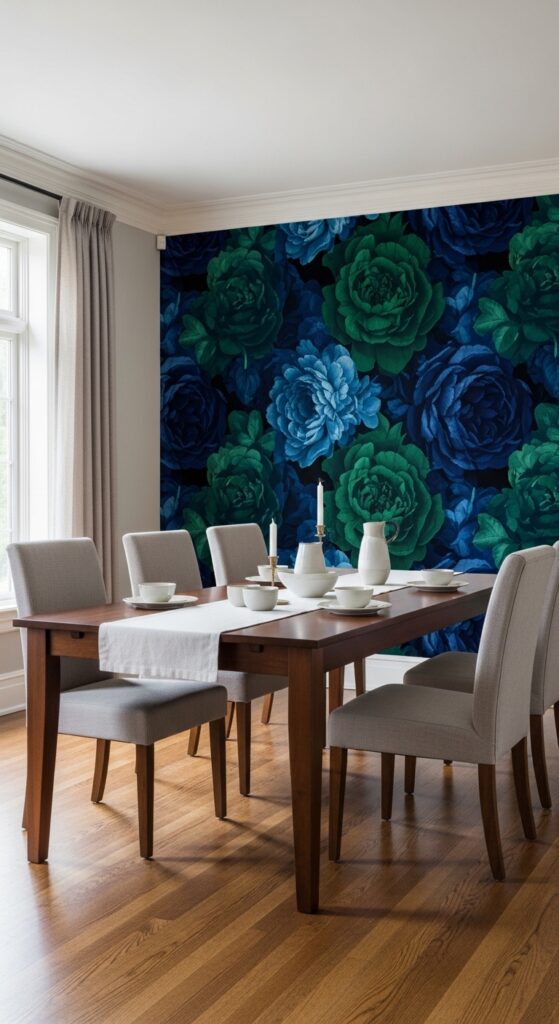 Choose oversized botanical motifs in rich jewel tones like deep emerald or sapphire blue to establish dramatic focal points on accent walls. Consider pairing large-scale rose or peony designs with neutral furnishings to prevent overwhelming your space. You can balance bold patterns by selecting solid-colored dining chairs and simple table linens that complement your wallpaper’s color palette for harmonious results.