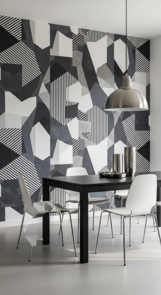 Mix metallic accents with geometric wallpaper to amplify modern elegance and create depth that enhances your dining experience.