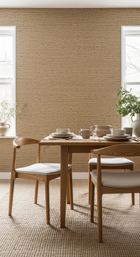 The natural beauty of woven fibers adds depth and visual interest while maintaining an understated elegance that complements any dining furniture style. Choose neutral tones like warm beige or soft gray for versatility, or select deeper earth tones for dramatic impact. The rich wood textures in your dining furniture will harmonize beautifully with grasscloth’s organic appeal, creating a cohesive earthy foundation. This wallpaper choice gives you the freedom to create a timeless dining environment.