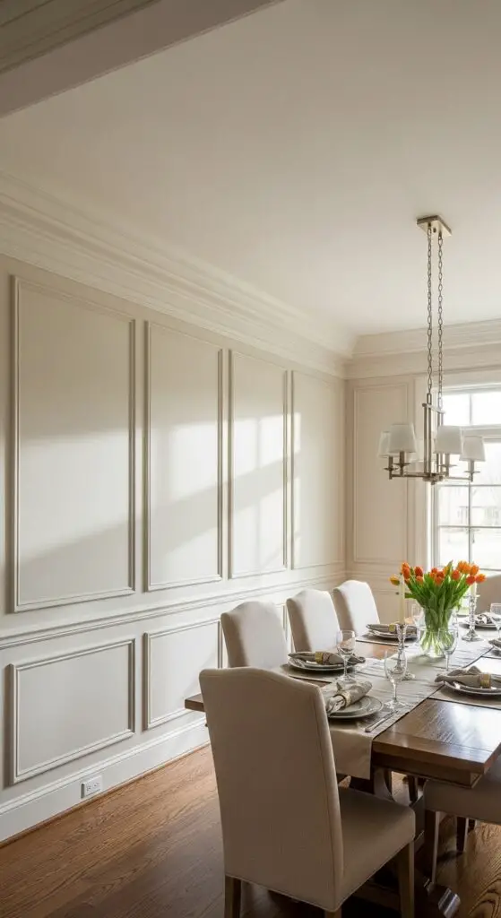 Crown molding frames your ceiling beautifully, while chair rails protect walls from furniture damage. Intricate panel details add luxury without overwhelming your space. Install wainscoting at one-third wall height for proper proportions. Choose paint colors that contrast subtly with your wall color to highlight the architectural features you’ve added. These wainscoting styles bring traditional charm while adding the architectural depth that transforms ordinary dining spaces into refined entertaining areas.