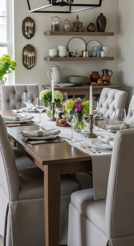 Select curated personal mementos like vintage family silver or handcrafted ceramics that spark meaningful conversations. Display thoughtful conversation pieces such as unique sculptures, rare books, or travel treasures on sideboards and shelves. Layer textures through quality linens, fresh flowers, and artisanal pottery.