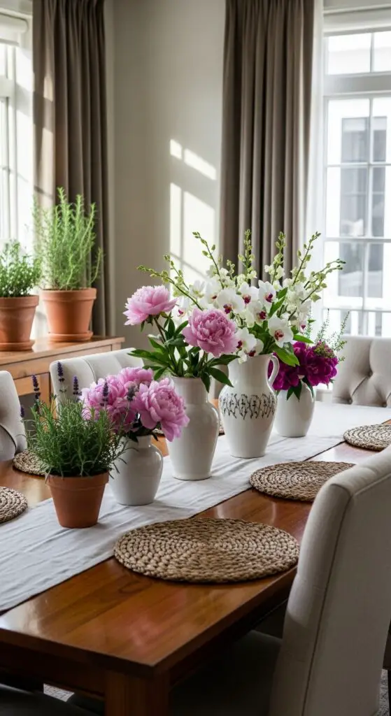 Fresh flowers and greenery breathe life into your dining room while creating a refined atmosphere that connects your indoor space with nature’s beauty. You’ll alter any meal into a sophisticated experience by selecting seasonal blooms that complement your color palette. Showcase natural centerpieces using fresh eucalyptus, peonies, or orchids in varying heights for visual interest.