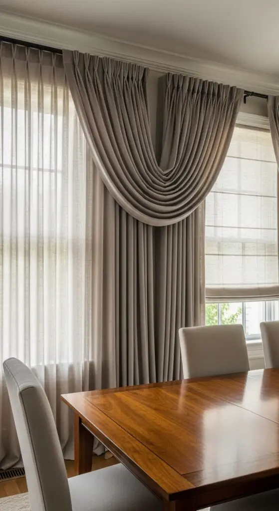 Start with sheer drapery panels closest to the glass for soft light filtering during daytime meals. Add heavier layered curtains in luxurious fabrics like silk or velvet as your outer layer for evening privacy and drama. Consider installing Roman shades underneath for precise light control.