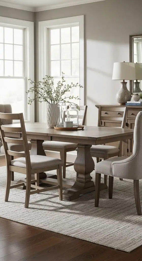 Choose dining tables with clean lines and sturdy construction that won’t look dated in ten years. Consider pedestal styles for their enduring elegance and space-saving design that works in both formal and casual settings. Select chairs featuring traditional shapes like ladder-backs or upholstered parsons styles that complement any décor changes you’ll make.