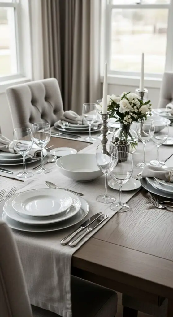 Choose sophisticated china patterns that complement your dining room’s color scheme and architectural details. Classic white porcelain offers timeless versatility, while subtle florals or geometric designs add visual interest without overwhelming your space.
