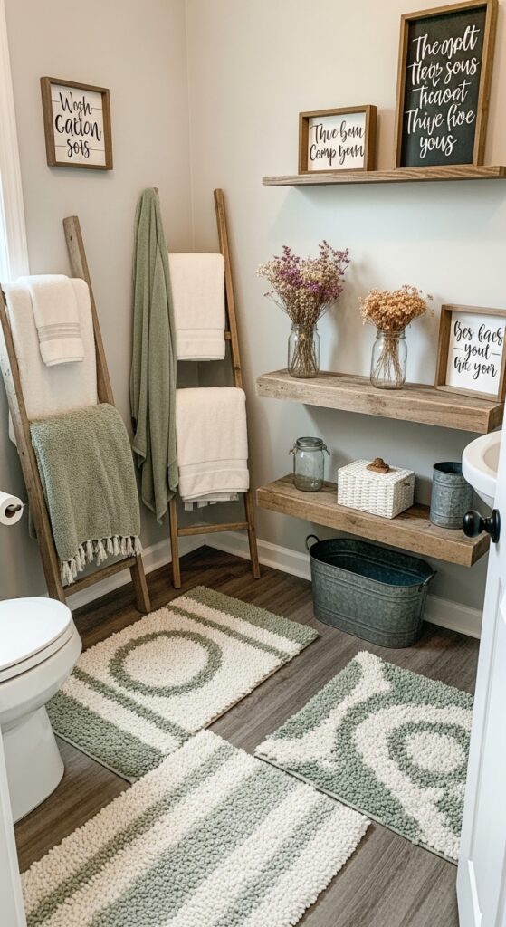 Display vintage mason jars filled with dried flowers or cotton stems on floating shelves. Hang cozy throw blankets over ladder-style towel racks for both function and visual appeal. Add galvanized metal containers for storage and incorporate wooden signs with inspirational quotes to enhance your country theme.