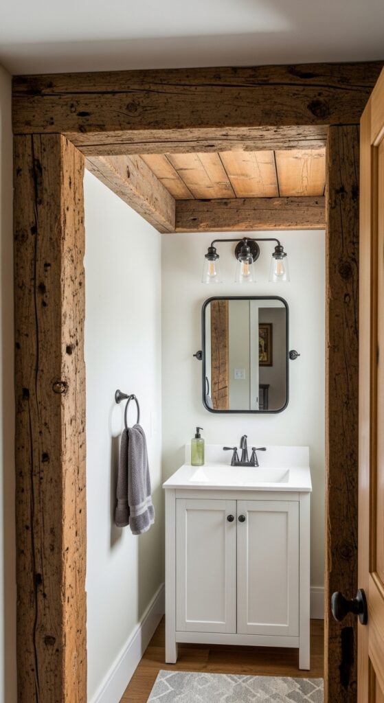 Exposed wooden beams instantly alter any half bathroom into a rustic sanctuary that captures the essence of authentic farmhouse design. You’ll create dramatic visual interest by installing distressed wood beams across your ceiling, metamorphosing ordinary spaces into character-rich retreats.