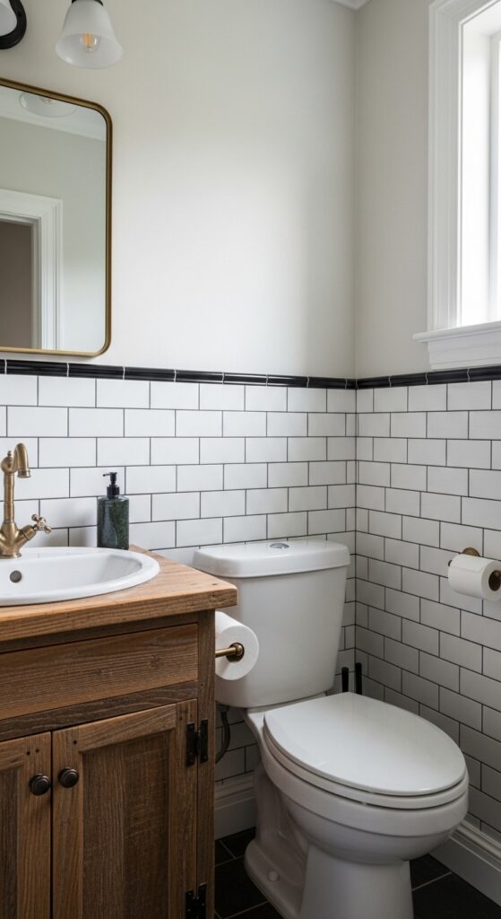 Experiment with unique grout patterns like herringbone or vertical stacking to break away from traditional horizontal layouts. These arrangements add visual interest while maintaining the farmhouse style’s simplicity. Dark grout also hides dirt better than light alternatives, making maintenance easier in your high-traffic powder room.