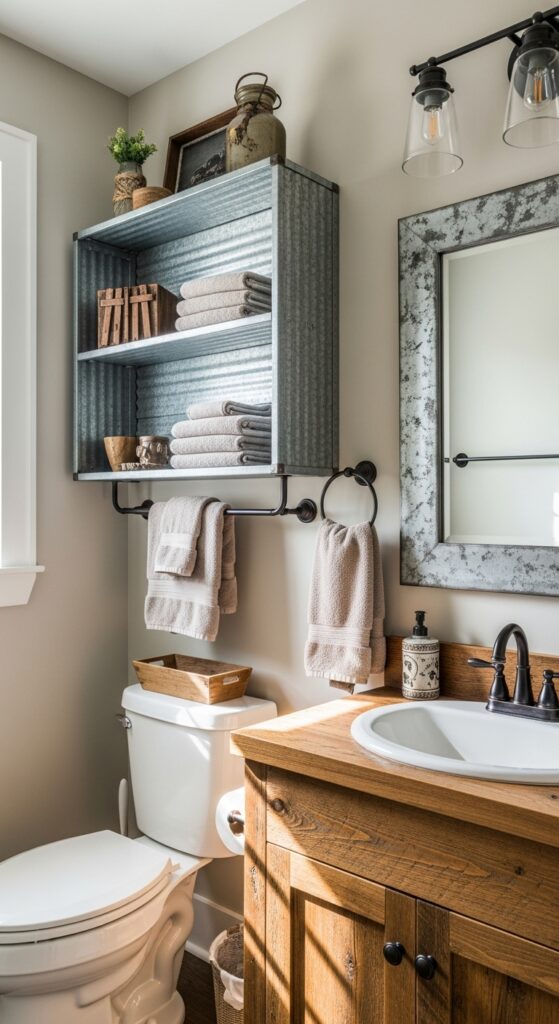 Install galvanized metal shelving above your toilet or beside your vanity for practical storage that doubles as décor. These sturdy shelves hold towels, toiletries, and decorative items while maintaining their rustic appeal. For added visual interest, consider incorporating tile patterns on your half bathroom floor that echo the geometric lines of your metal fixtures.