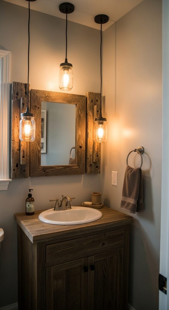 Mason jar lighting alters ordinary half bathrooms into charming farmhouse retreats through rustic fixtures that blend functionality with authentic country style. You’ll find that rustic mason jar sconces mounted beside mirrors create warm, inviting illumination while maximizing your limited wall space.