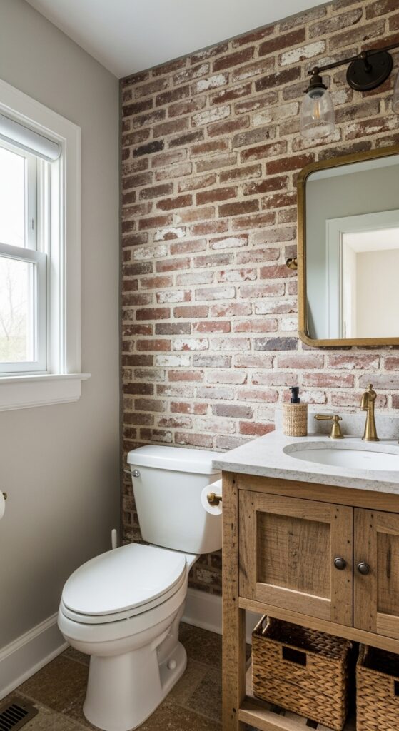 Brick feature walls behind your toilet or sink instantly transform plain surfaces into eye-catching design elements. You can choose from weathered reclaimed brick for vintage appeal or clean white-washed brick for lighter aesthetics. These durable materials require minimal maintenance while providing maximum visual impact in your cozy retreat.