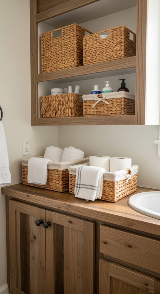 Mount rustic shelving units above your toilet or beside the vanity to showcase these natural storage gems. Choose varying basket sizes to accommodate different items—small ones for soap bars, medium ones for washcloths, and larger options for cleaning supplies. This approach keeps essentials accessible while creating visual interest through texture and organic shapes.