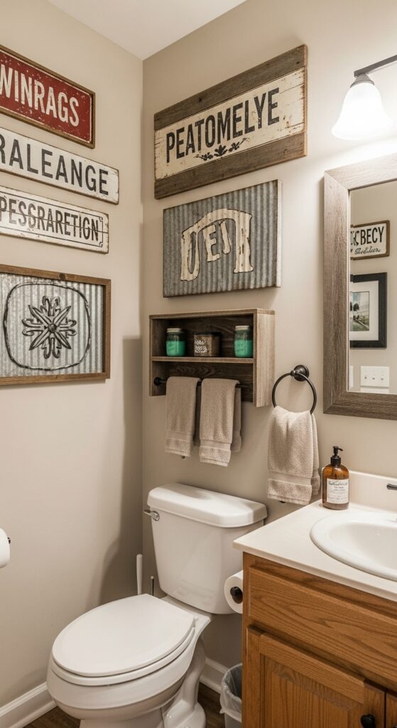 While storage solutions manage the practical aspects of your farmhouse half bathroom, vintage signs and wall décor alter blank surfaces into engaging focal points that narrate your home’s story.