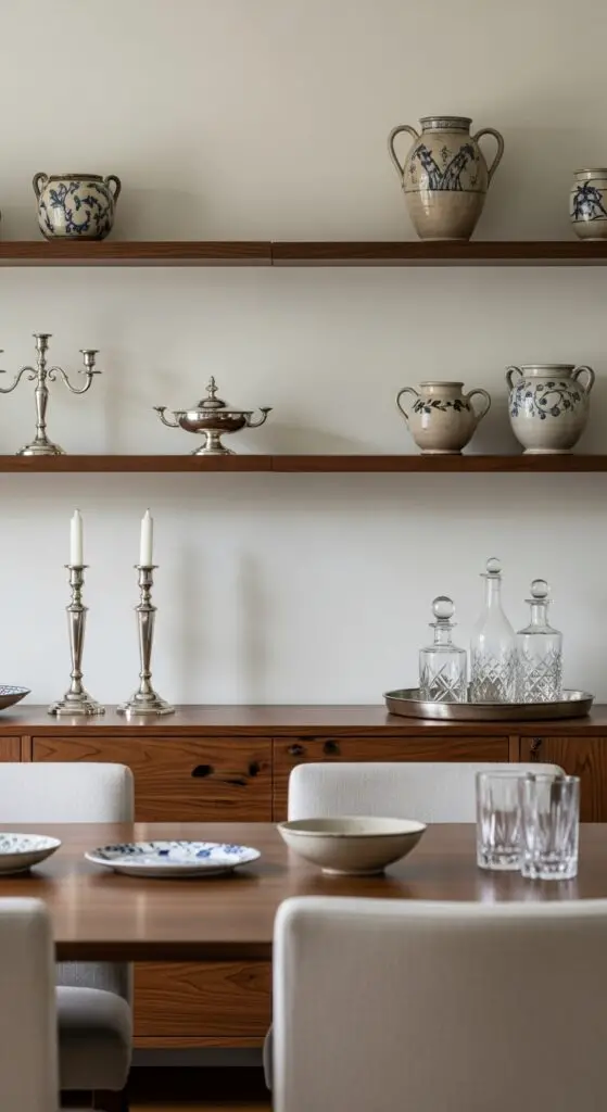 Display curated collections strategically throughout the space – perhaps fine china in a hutch or artisanal pottery on floating shelves. Choose pieces with classic shapes and neutral tones that won’t feel dated in five years. Remember, less is more when creating a refined atmosphere that feels both timeless and personal.