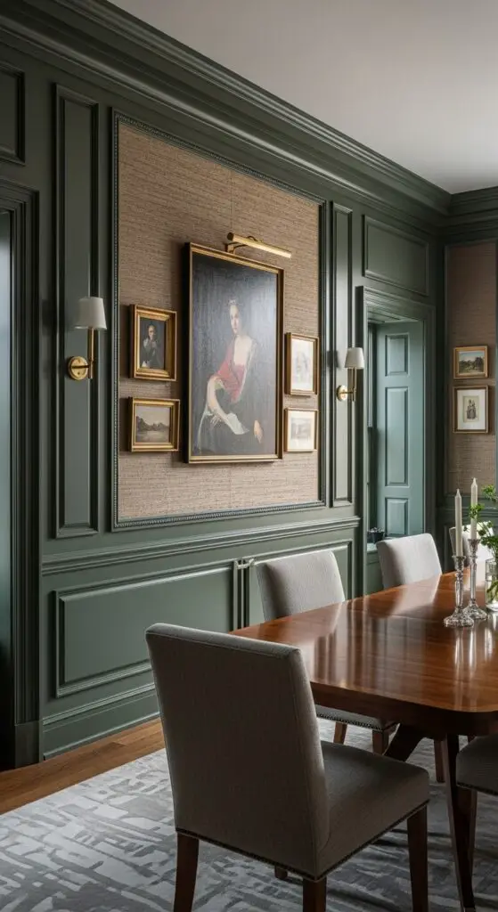 Consider wainscoting with intricate molding details or full-height paneling in deep navy or forest green hues. These treatments create natural frameworks for curated artwork placement, allowing you to showcase prized pieces strategically. Elegant wainscoting styles bring traditional charm while adding the architectural depth that transforms ordinary dining rooms into distinguished spaces.