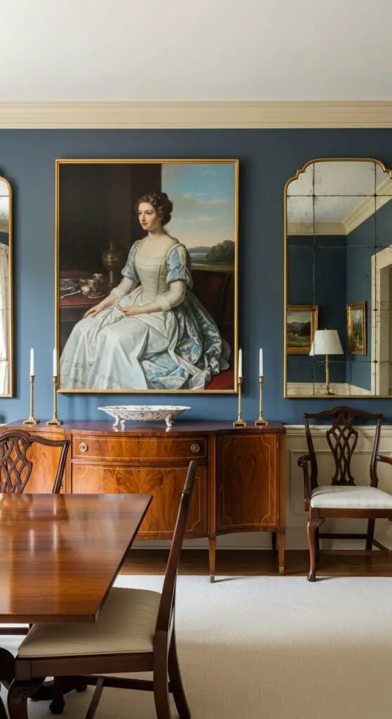 Beyond selecting beautiful furnishings, you’ll want to establish a commanding visual anchor that draws the eye and accentuates your dining room’s sophistication. Large-scale artwork creates instant drama when positioned above sideboards or buffets, while statement mirrors amplify light and space magnificently.