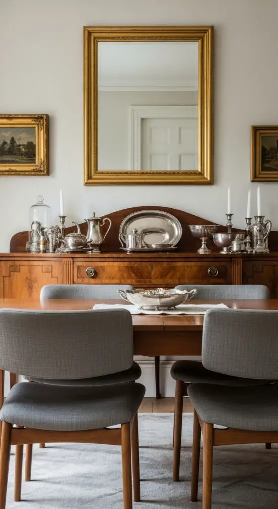 Carefully selected decorative objects can raise, heighten, or enhance your formal dining room from simply functional to truly memorable. You’ll want to incorporate heirloom accessories that tell your family’s story while maintaining sophisticated appeal. Consider sterling silver candlesticks, vintage crystal decanters, or antique serving pieces that add both beauty and purpose.