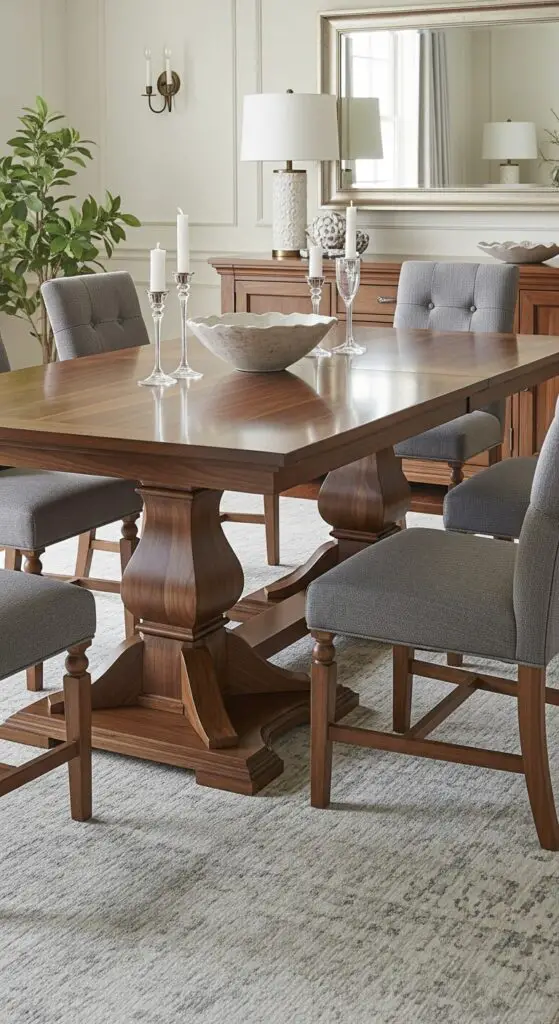 Quality wood furniture serves as the cornerstone of any sophisticated formal dining room, building upon your carefully selected color foundation. Choose pieces with clean lines and traditional proportions that won’t look dated in twenty years.