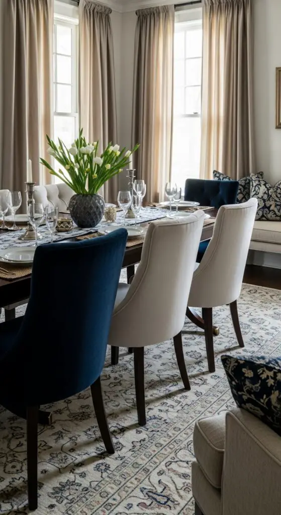 Carefully selected textiles reshape your formal dining room from a simple eating space into a graceful sanctuary that beckons guests to linger. Add plush area rugs beneath your dining table to define the space while providing comfort underfoot. Choose patterns that complement your color scheme without overwhelming the room’s elegance.
