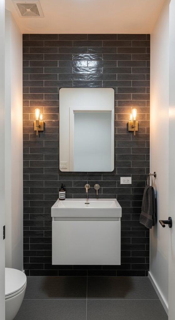 If you’re ready to create visual drama in your half bathroom, charcoal tile accent walls deliver the perfect balance of boldness and sophistication. Choose one wall behind your vanity or toilet to showcase dark subway, hexagon, or natural stone tiles.