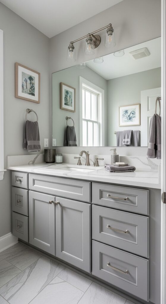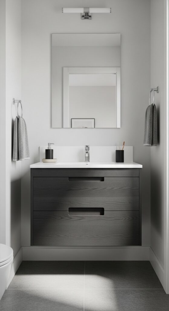 You can also mix grey lower drawers with white upper storage, creating visual layers that make your compact space feel more varied and intentionally designed. Complement your vanity with coordinating floor tiles that tie the grey and white palette together throughout the space.