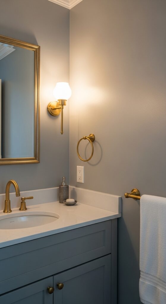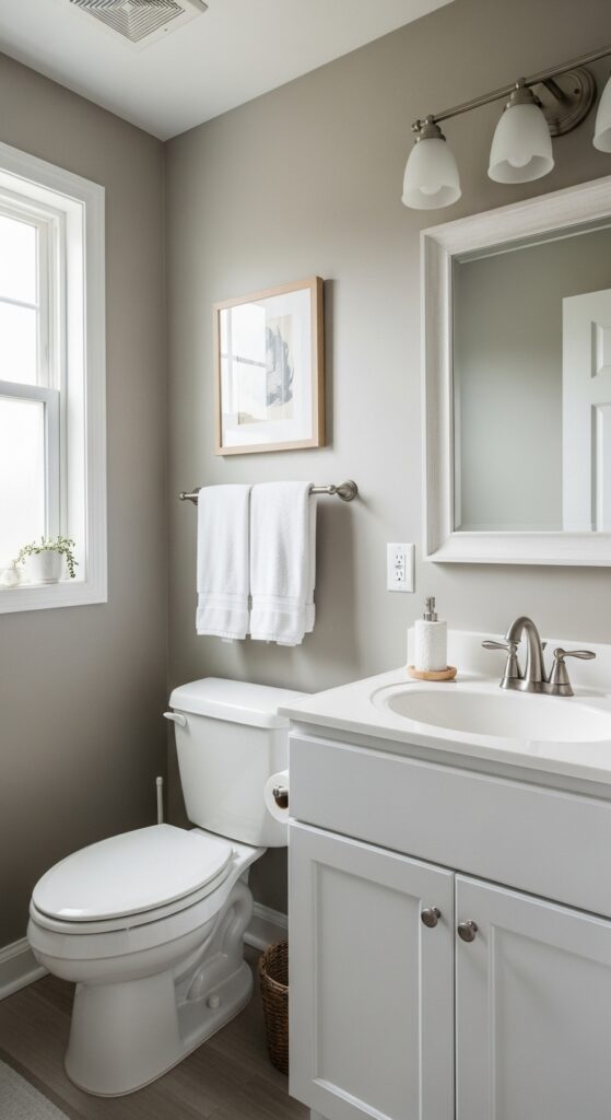 While cool greys can make small spaces feel stark and unwelcoming, choosing warm grey paint colors alters your half bathroom into a cozy retreat that guests will actually enjoy using. You’ll want to select inviting neutral tones with beige, taupe, or soft brown undertones that create warmth without sacrificing sophistication.